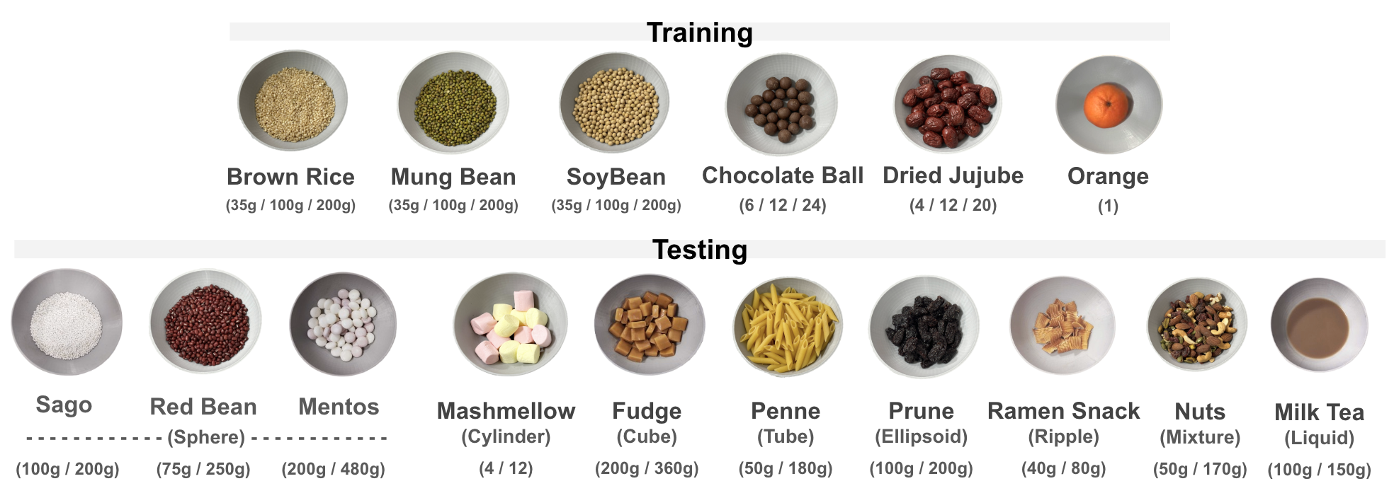 In the real-world experiments, we prepare 6 food categories for training (top row) and 10 unseen food categories for testing (bottom row), covering diverse shapes, quantities, and material properties.