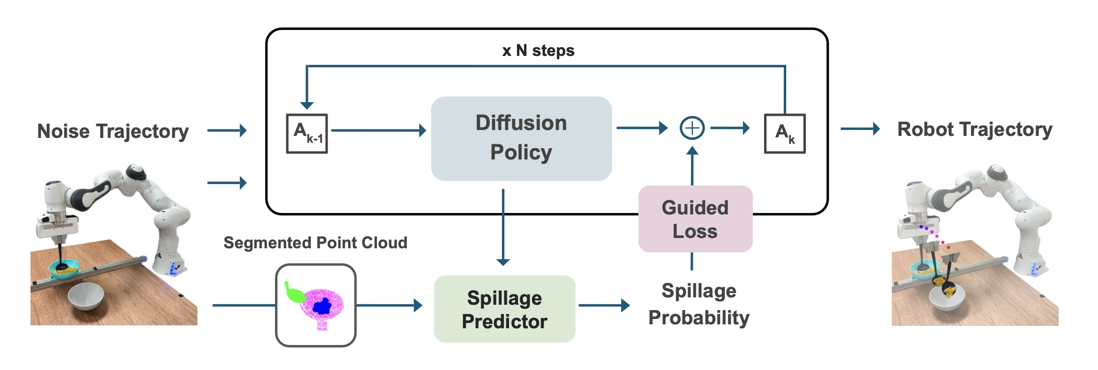 During inference, given current observation and an initial noisy trajectory, the diffusion policy denoises it into a refined trajectory. A spillage predictor, which takes segmented point clouds as input to reduce the sim-to-real gap, estimates the probability of spillage for given candidate trajectory. This probability provides a guidance signal that steers the denoising process toward safer trajectories. The robot then follows the refined trajectory using position control to scoop food items.