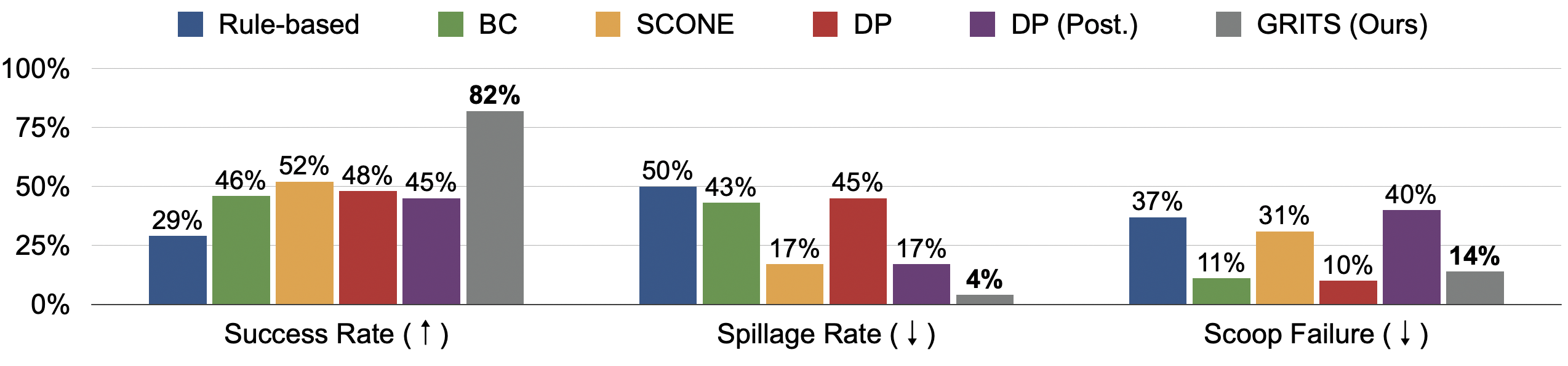 With spillage predictor, GRITS captures the food states and dynamics at each step and guide the robot motion generation accordingly to prevent risky spillage scenarios, achieving highest 82% success rate and lowest 4% spillage rate. Compared to unguided baselines, GRITS reducres spillage cases by over 40%.